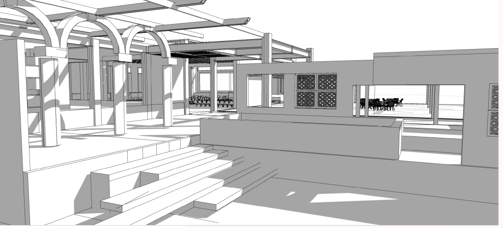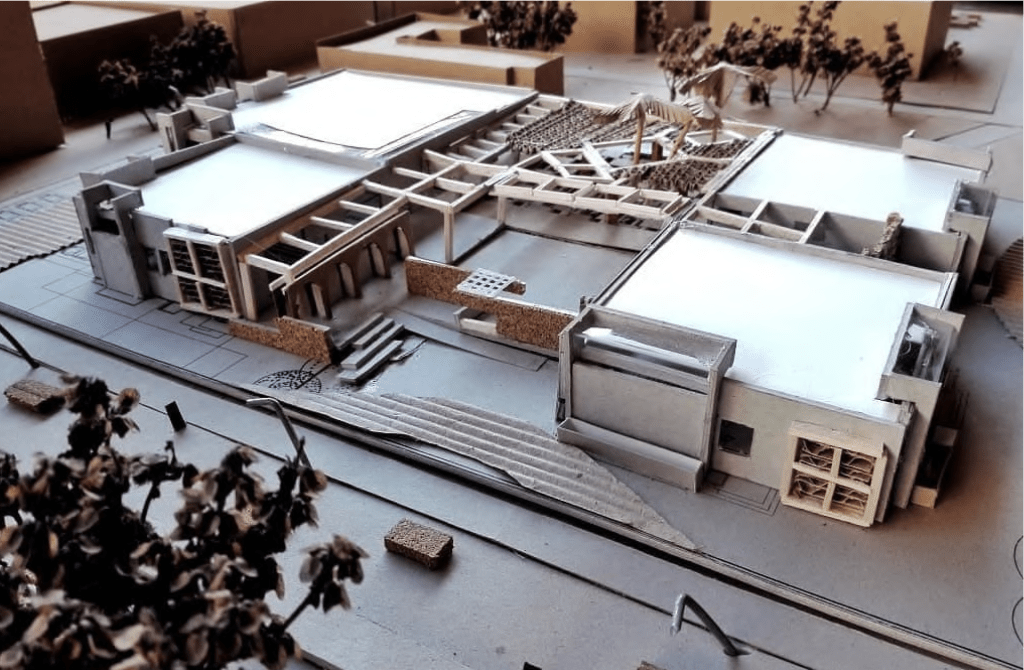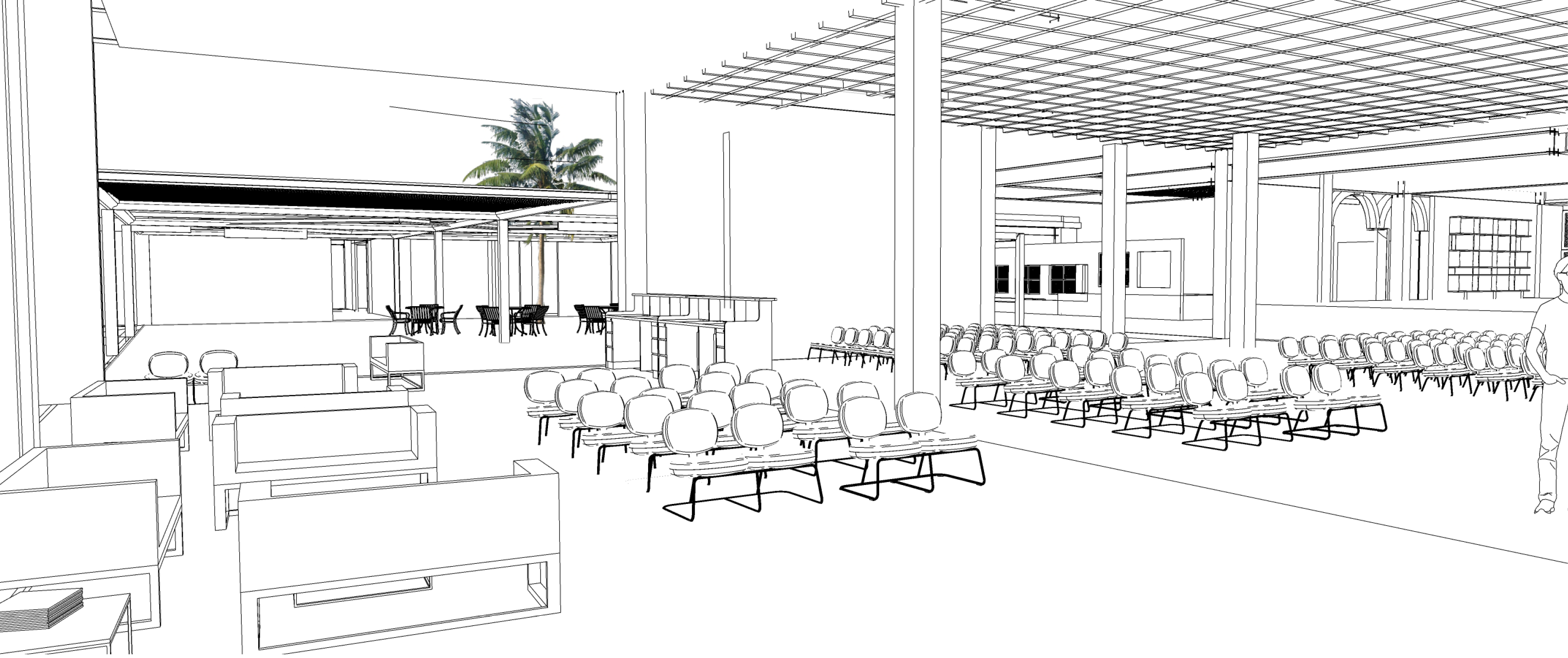 A green wedge of existing palm trees turns into two courtyards. A framework and grid holding different layers of memory and identity. A fragmented facade, parts to the whole. The wall turns into window, window seat, exhibit light well, planter and exhibition space.