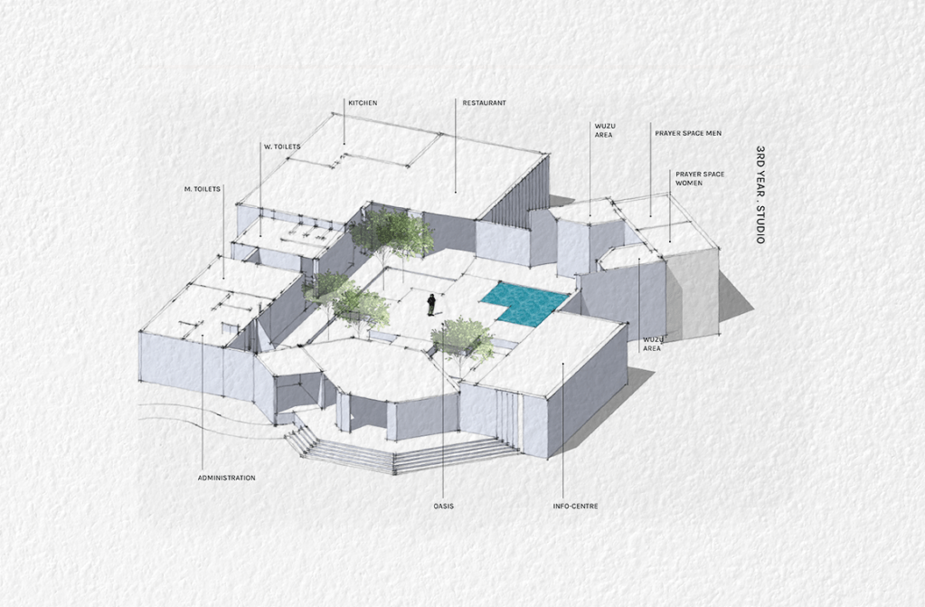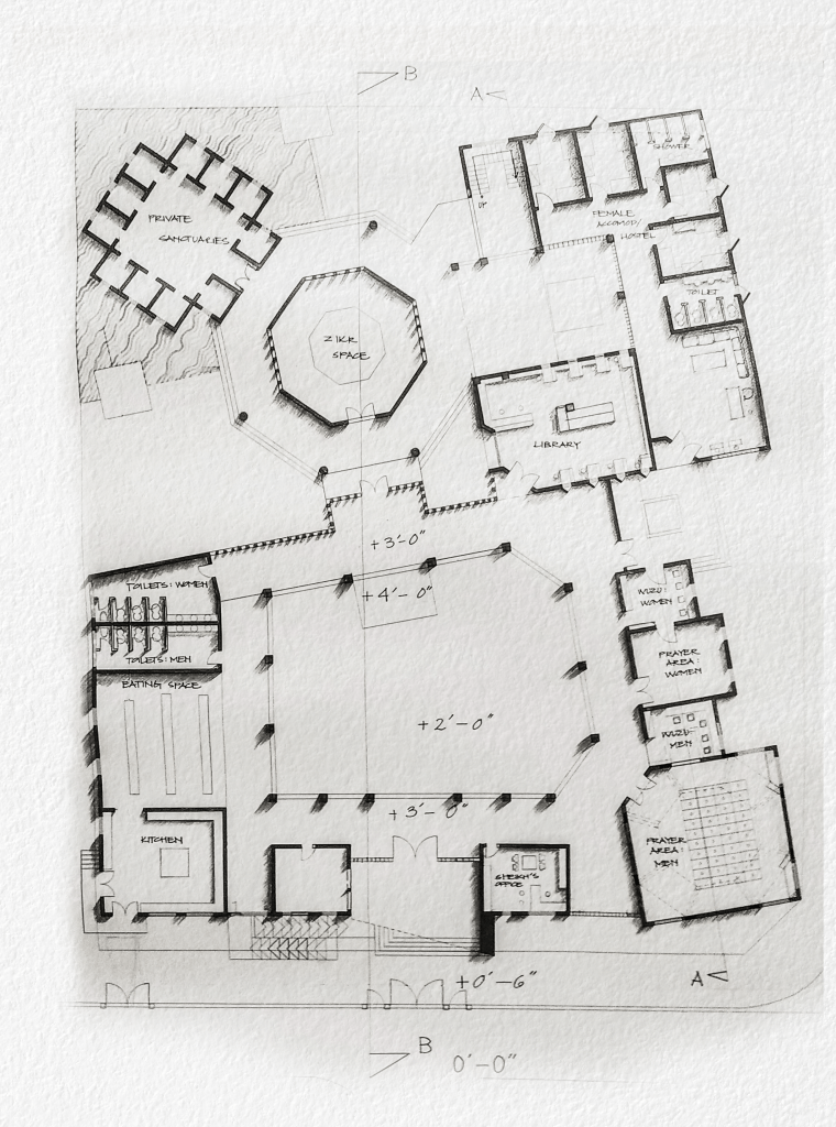 A site visit to Bhit Shah and the immersive experience of the activities at the Shrine of Shah Abdul Latif Bhittai profoundly inspired the concept for this Contemporary Sufi Khanqah. The aim was to design spaces through a meticulous analysis of ritualistic activities in isolation and then to synthesize the program based on the transition between collective and individual worship. The process was akin to assembling a complex puzzle, a challenge that proved to be the most enjoyable aspect of the project.