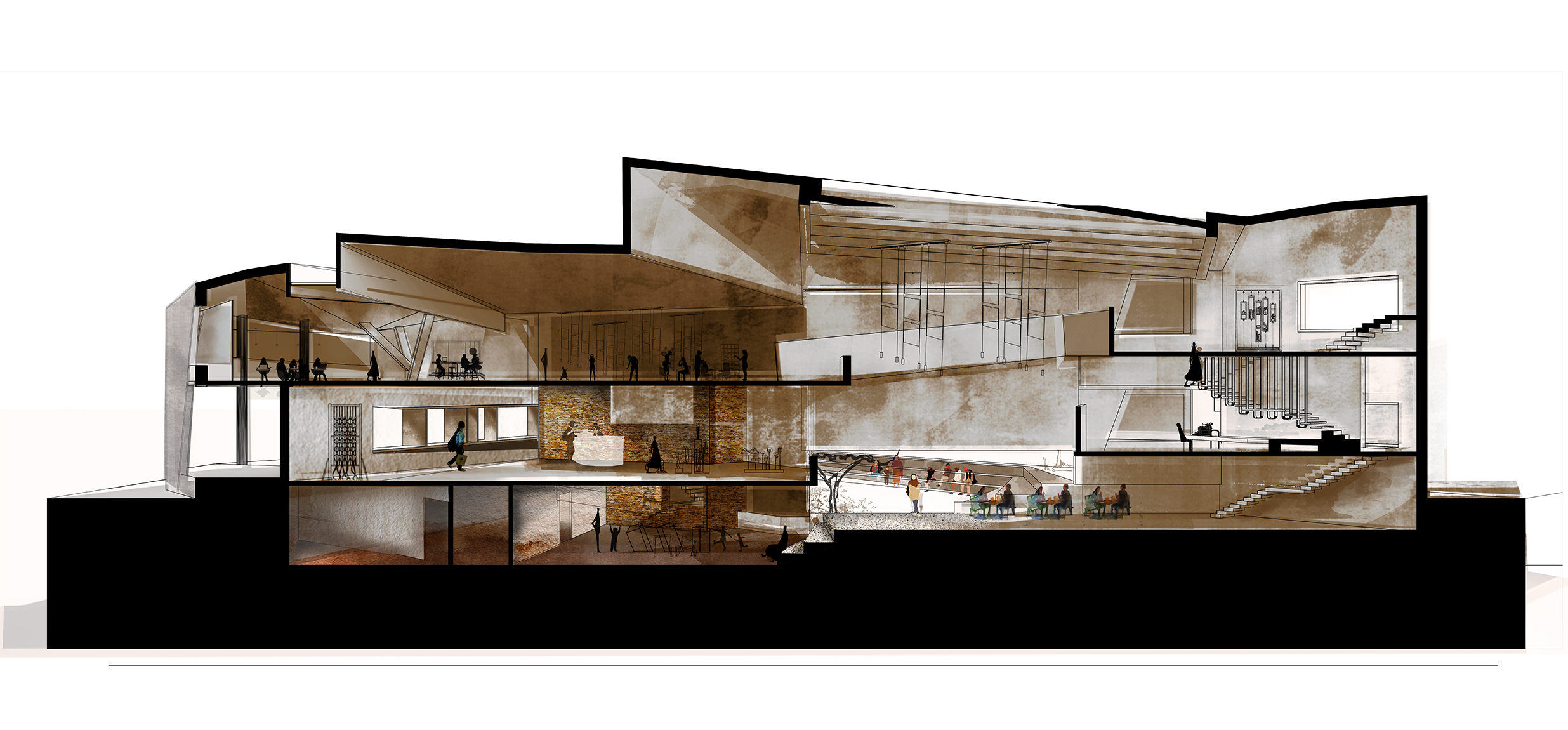 The section reveals the multiple levels of the museum, including the central Guzargah space which the internal ramps wrap around walking one through the split sections of the museum. The vertical promenade of the museum employs a mix of discovery learning and stimulus response as a pedagogical model.