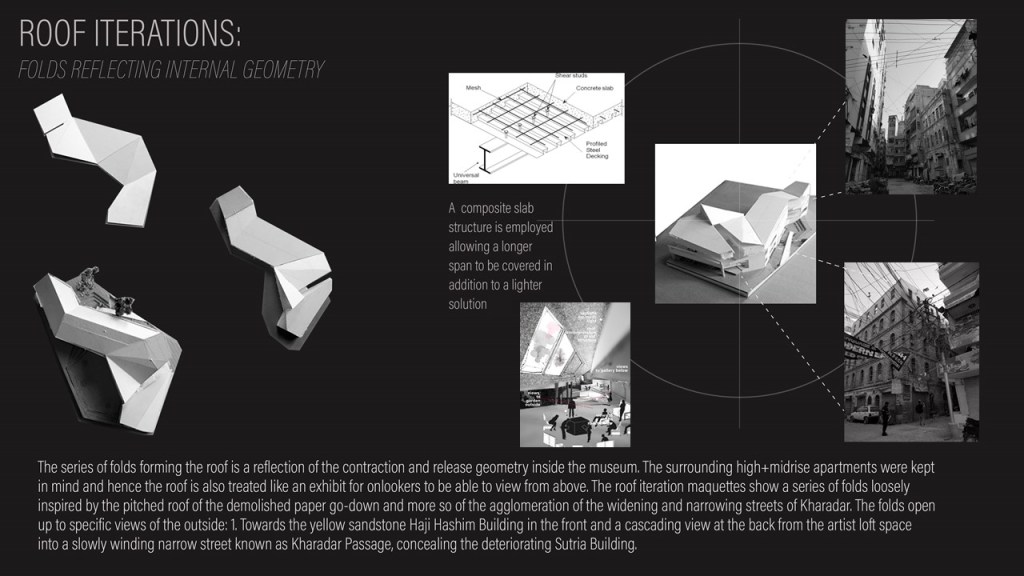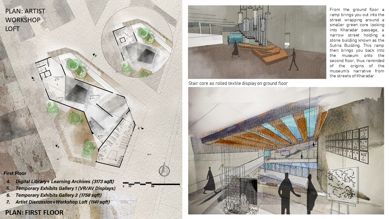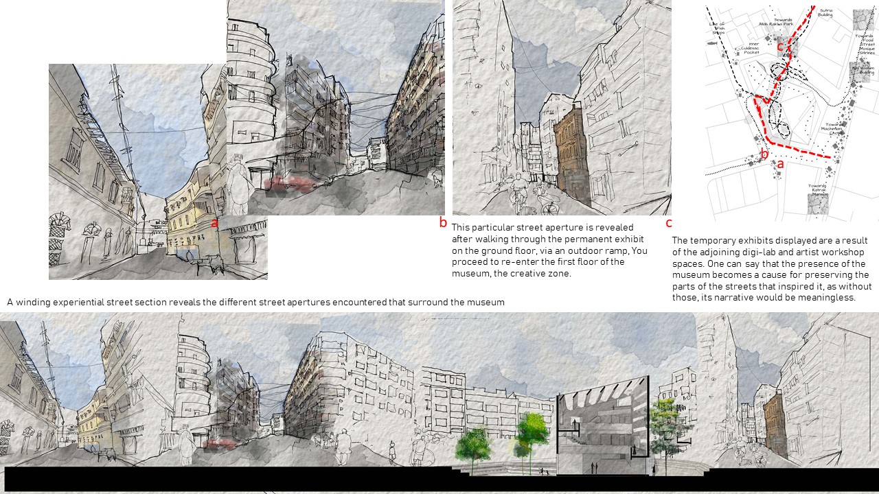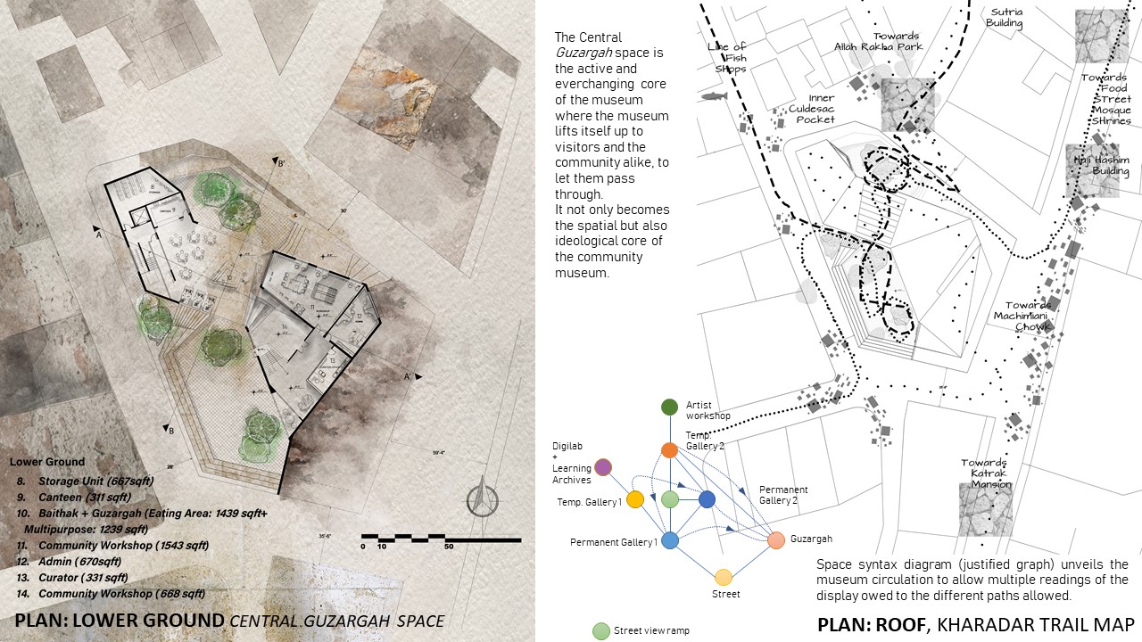 This thesis project was an investigation of the museum typology by identifying the institution’s evolving definitions and weighing its potential to frame and enable community identity in Karachi. Recognizing the city as a complex weave of different groups, instead of a single monolithic museum, multiple small community museums are advocated. The neighborhoods of Khara- Mithadar are chosen as a starting point to test this. Its identity is a tangle of different threads (religion, language, trade, the built environment, profession, cuisine) that in the urban context takes the form of trails. The spatial logic of navigating the labyrinthine streets whilst salvaging the origins of the museum as a place to think, be inspired and learn while engaging in dialogue become the tools to explore the spatial experience and program of this project.